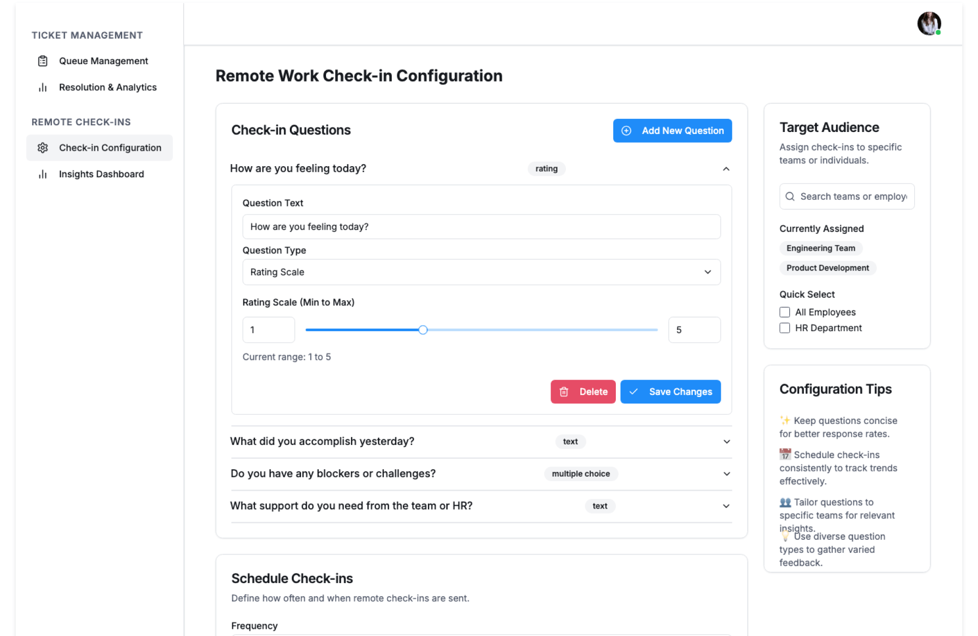 The Remote Work Check-in Bot by Kriatix helps organizations maintain visibility, engagement, and productivity across distributed teams. It automates daily, weekly, or custom check-ins to capture work updates, availability, mood, and blockers—so managers stay informed without constant meetings or manual follow-ups.