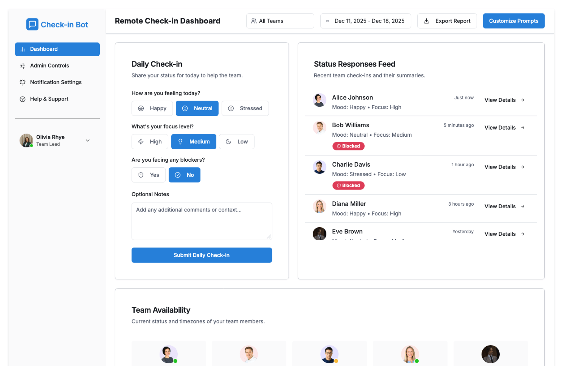 - Work status, blockers, and availability tracking