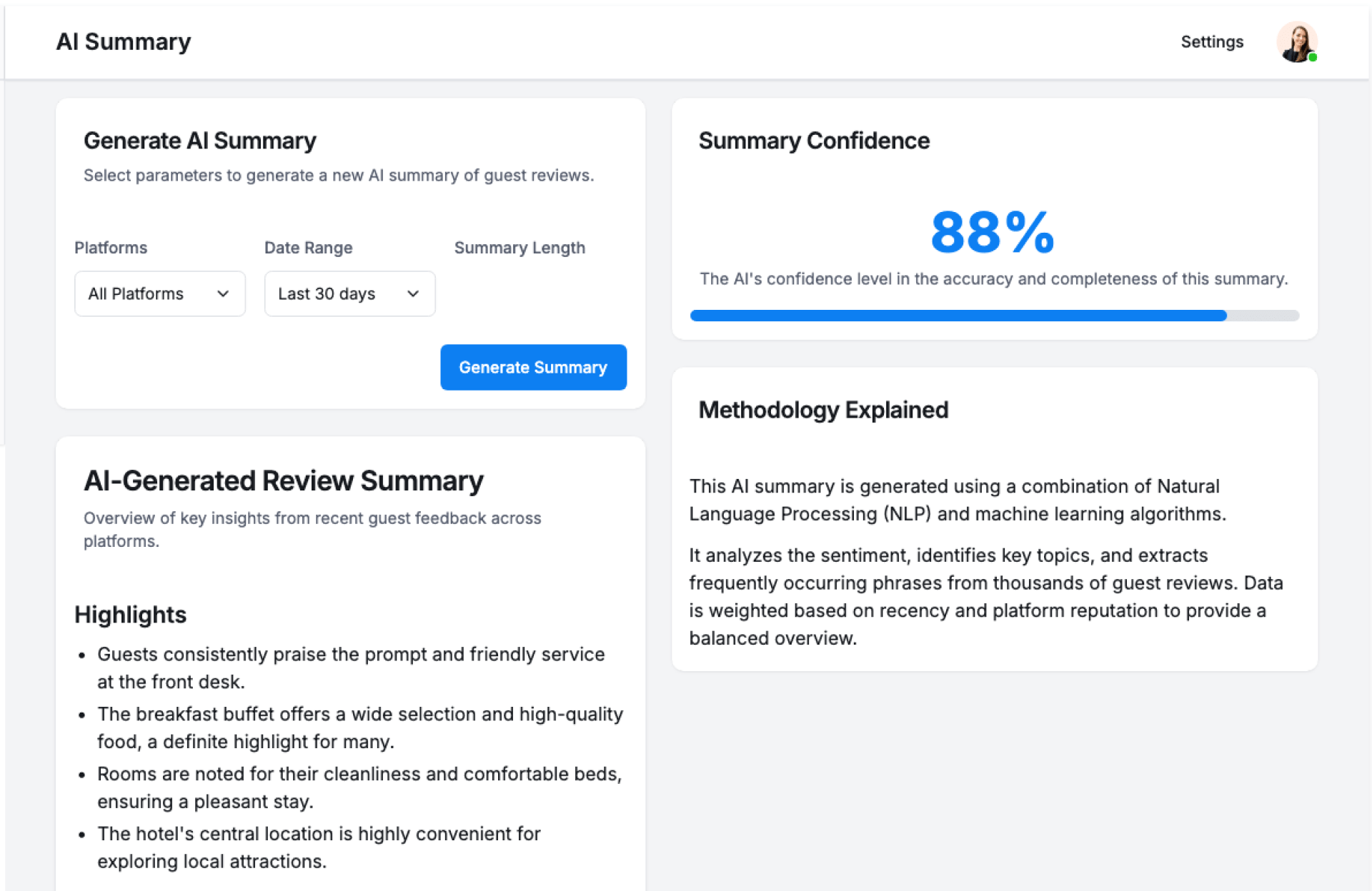 The Review Summary Widget for Hotels is an AI-powered analysis component that aggregates reviews from multiple sources and presents concise summaries. It transforms large volumes of guest feedback into clear highlights that can be viewed internally or displayed on hotel websites.