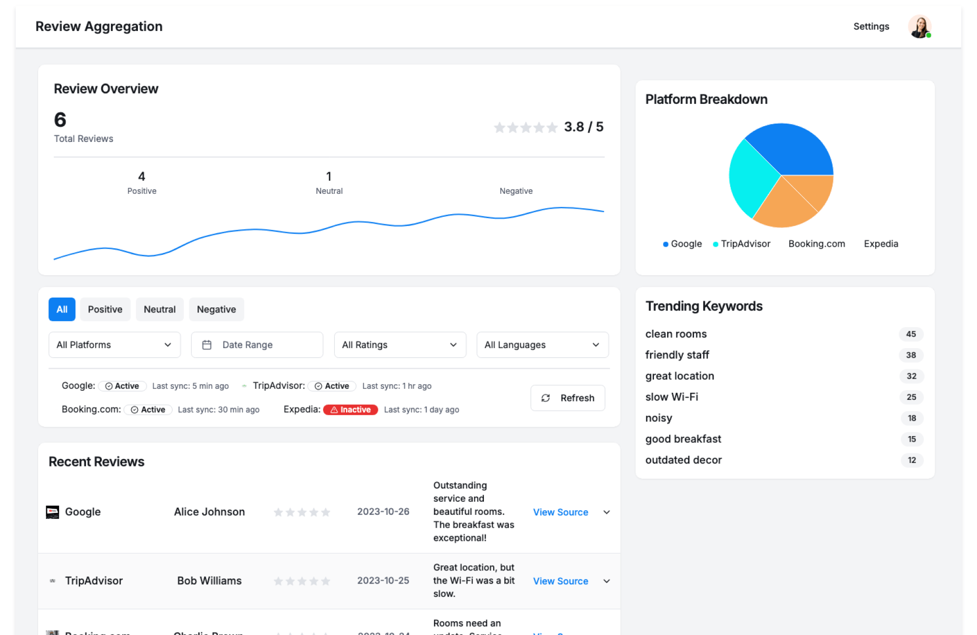 The Review Summary Widget for Hotels is an AI-powered analysis component that aggregates reviews from multiple sources and presents concise summaries. It transforms large volumes of guest feedback into clear highlights that can be viewed internally or displayed on hotel websites.