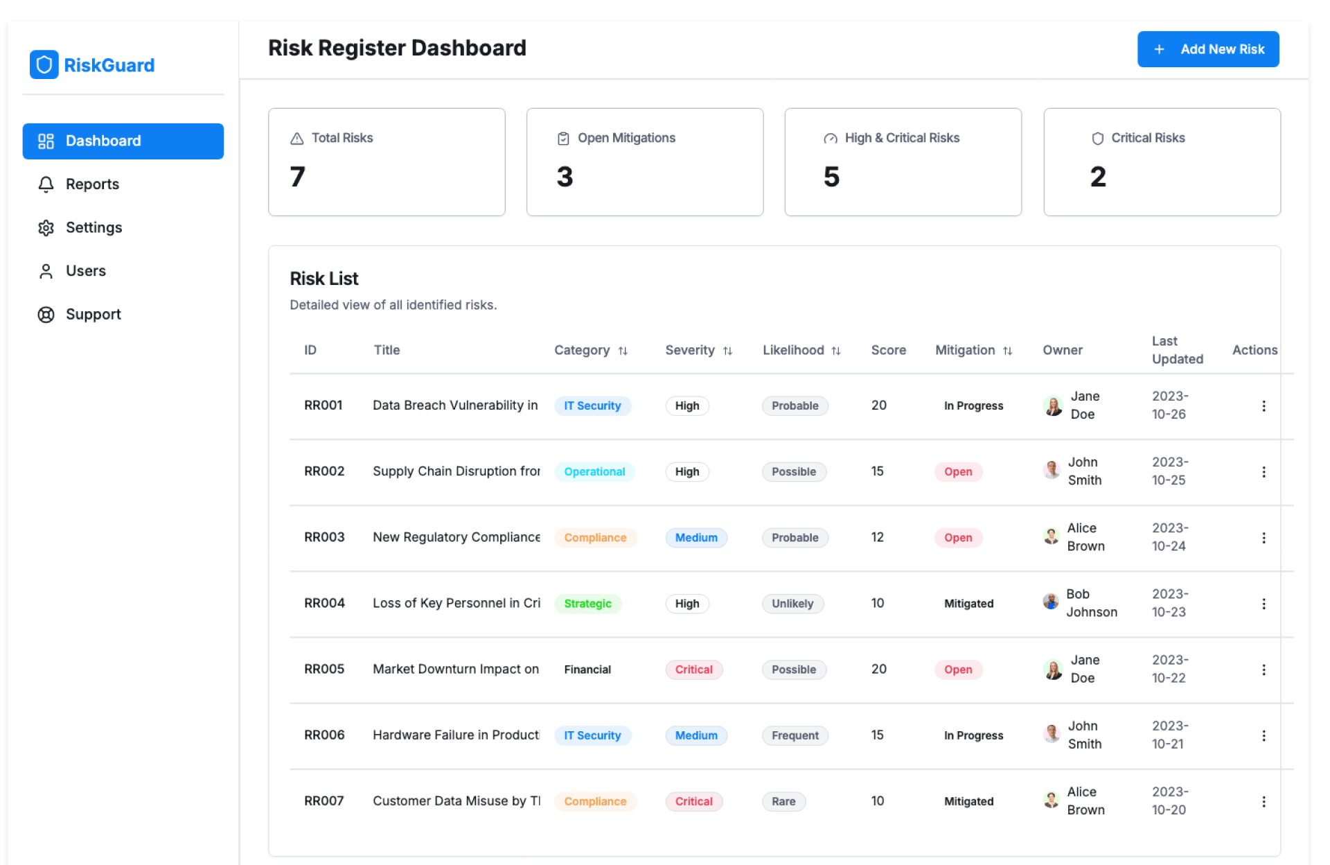 The Risk Register Dashboard is an AI-powered solution designed to capture, track, and monitor risks in a structured and transparent manner. It enables organizations to maintain a live risk register with real-time visibility into risk status, severity, and mitigation progress.