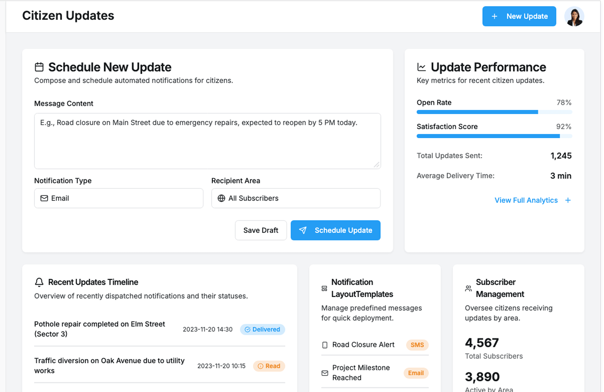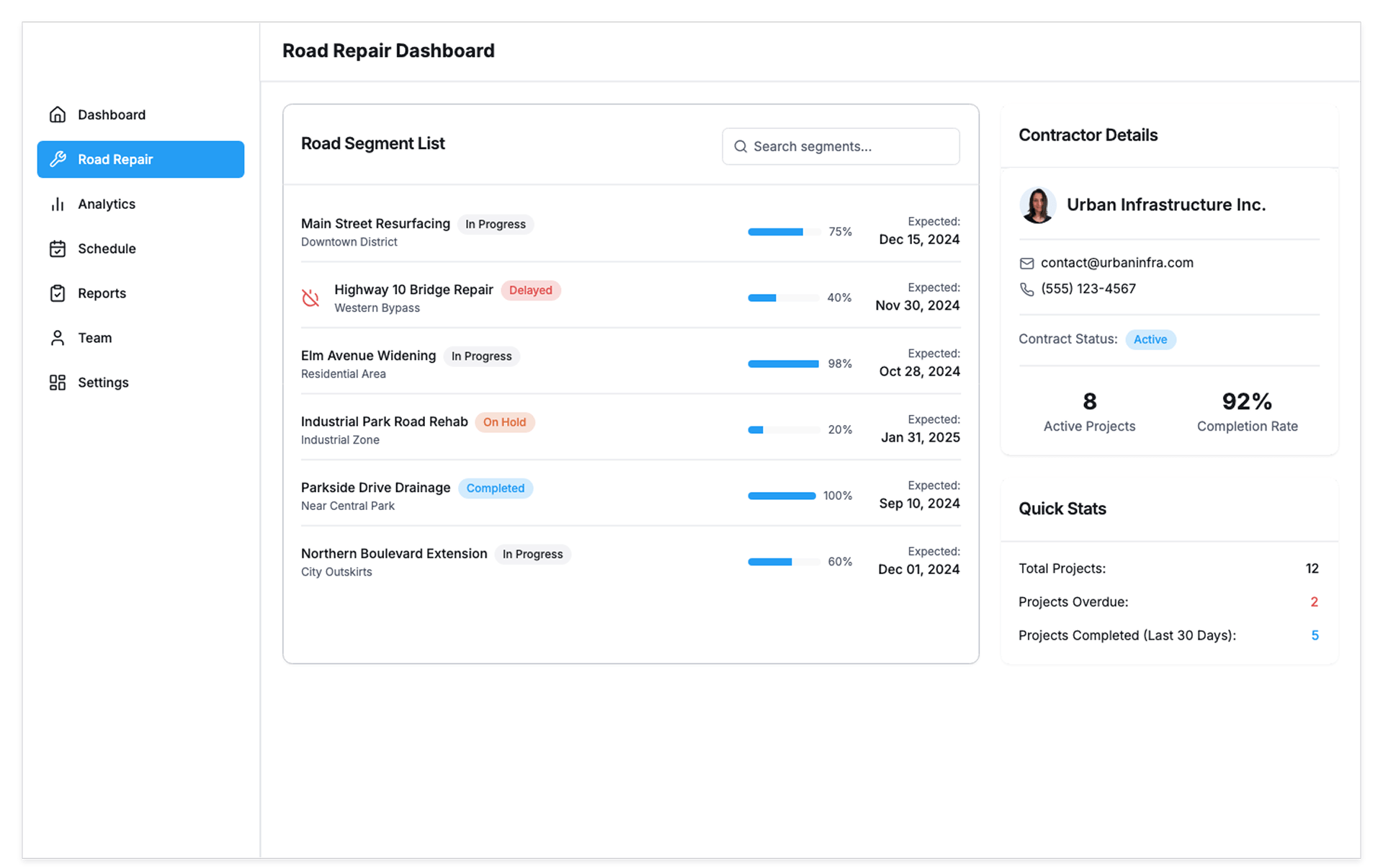 The Road Repair Progress Monitor by Kriatix helps municipal authorities and infrastructure teams monitor road repair projects in real time. It provides clear visibility into repair status, timelines, and completion progress across locations.
