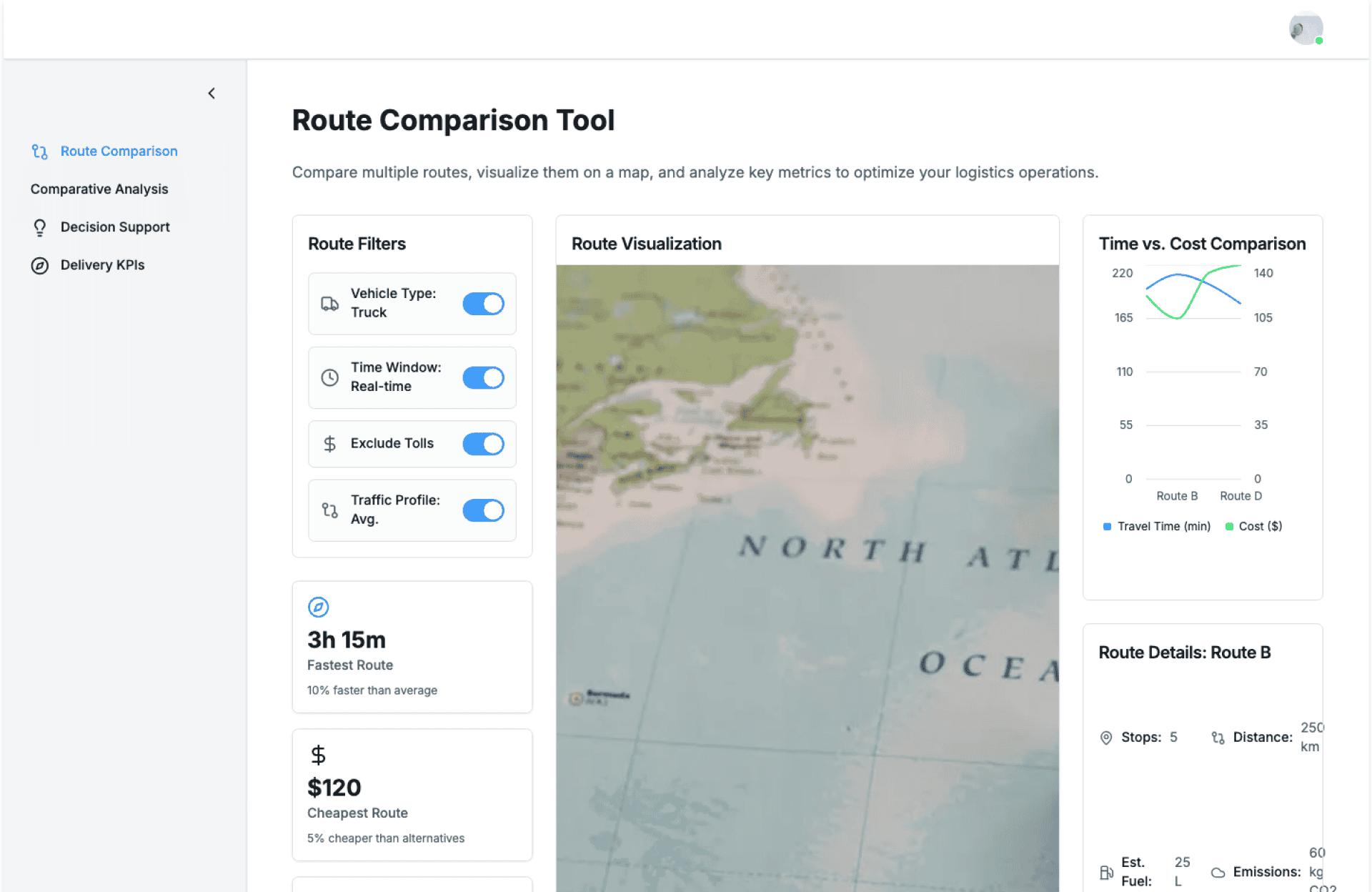 The Route Comparison Tool is a ready-to-use and customizable application that analyzes multiple route options between locations and compares them based on travel time, fuel or toll cost, distance, and operational impact. Built on the Kriatix AI platform, it enables data-driven routing decisions without complex system dependencies.