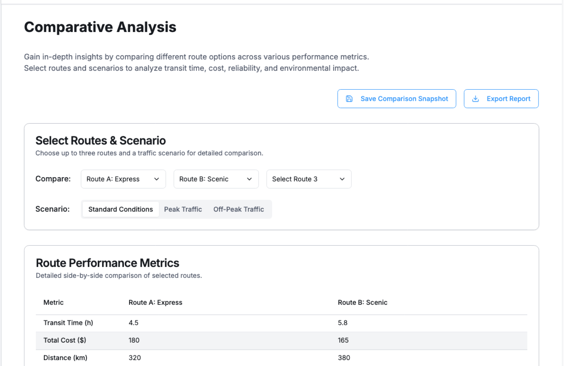 The Route Comparison Tool (Time vs Cost) by Kriatix is an AI-powered decision-support application that helps businesses compare multiple travel or logistics routes based on time, cost, and efficiency. Whether you manage deliveries, employee travel, or field operations, this tool gives you instant clarity on which route delivers the best value.