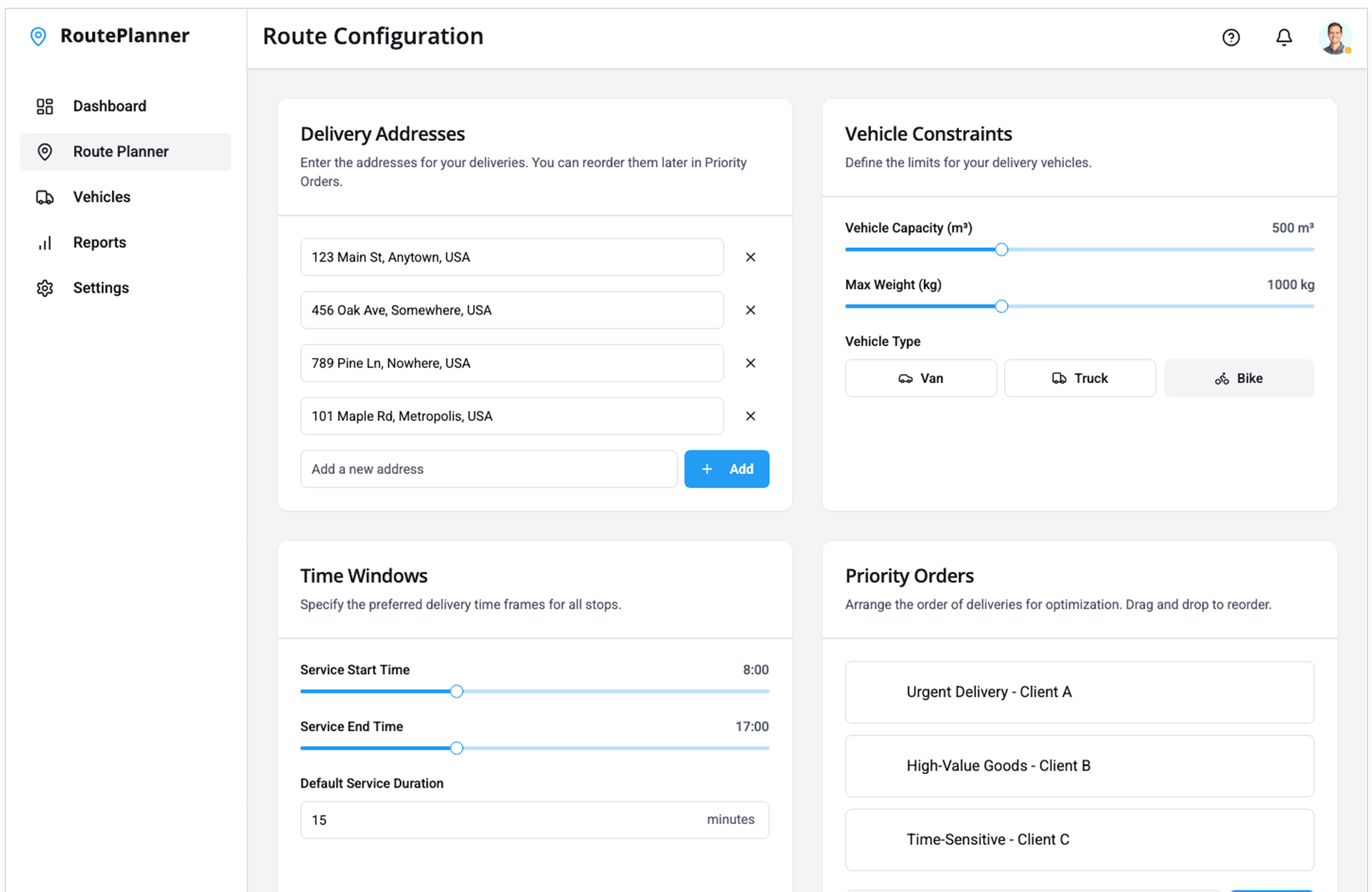 - Configure Constraints – Set delivery windows, vehicle capacity, priorities