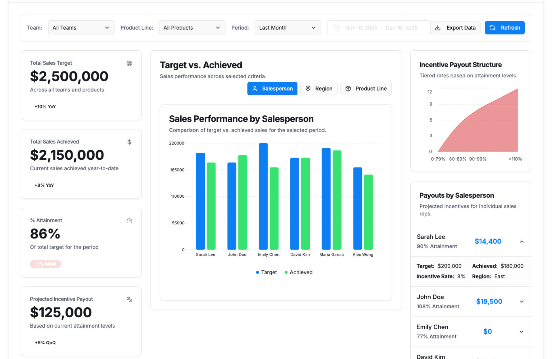 - Define Incentive Rules – Set targets, slabs, and payout logic