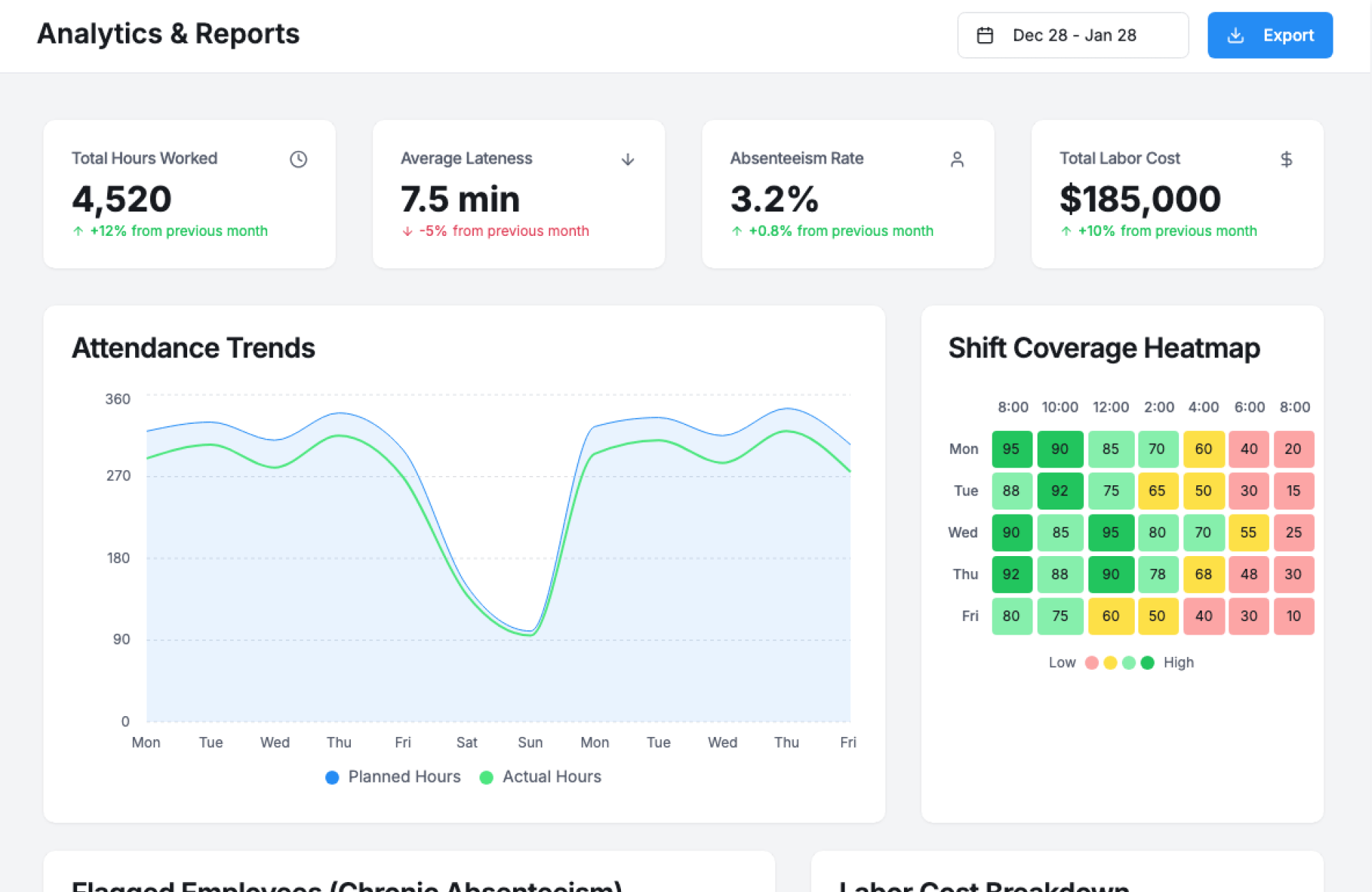 The Shift Attendance Dashboard is an AI-powered workforce monitoring solution that consolidates attendance data across shifts into a single view. It enables supervisors and HR teams to track attendance patterns, identify gaps, and ensure adequate staffing levels.
