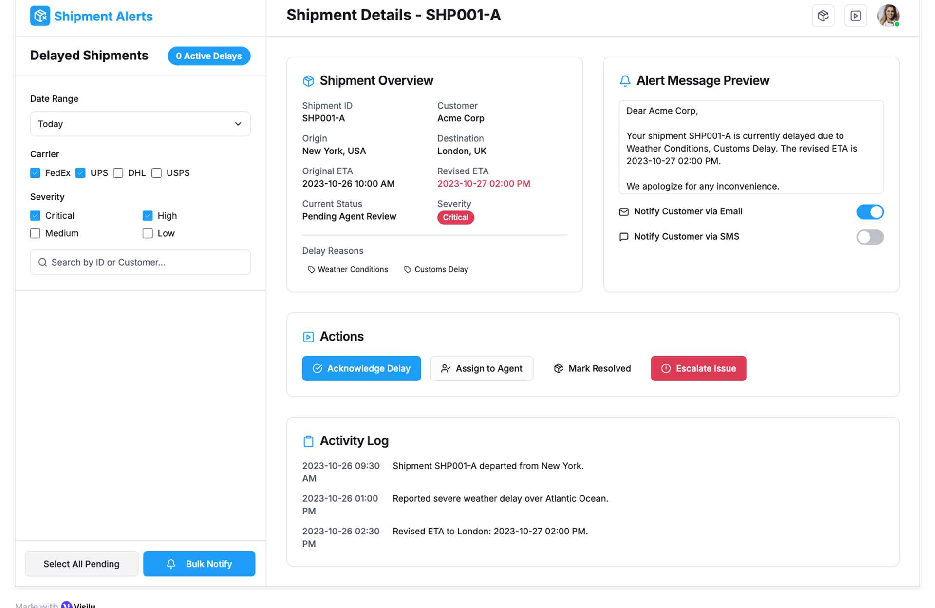 The Shipment Delay Alert Bot by Kriatix is an AI-powered automation solution that continuously tracks shipment movement, detects potential delays, and instantly alerts relevant teams and customers. Whether you manage logistics for eCommerce, manufacturing, or global supply chains, this bot helps you stay ahead of disruptions and maintain delivery commitments.