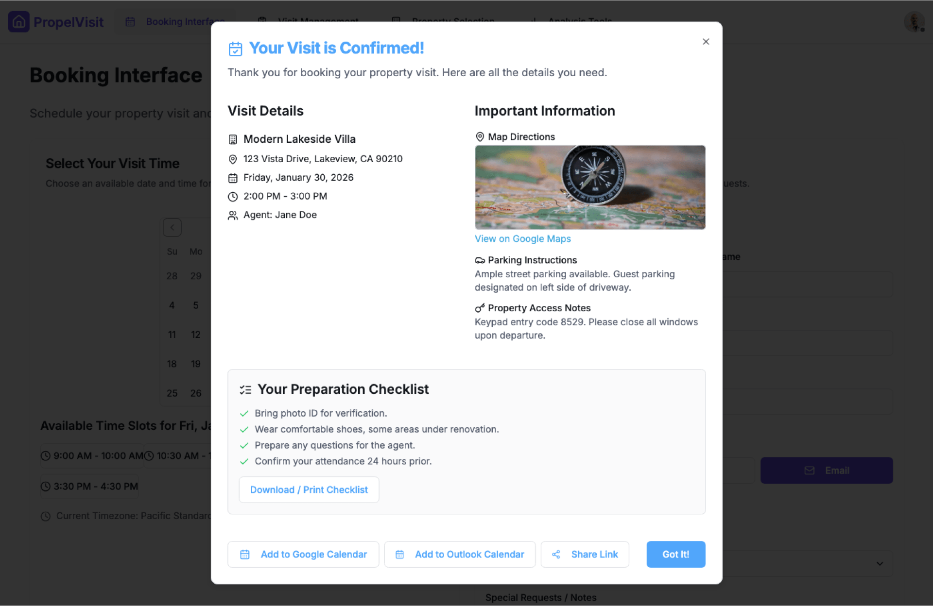 - Confirm Visit – Send confirmation to buyer and agent
