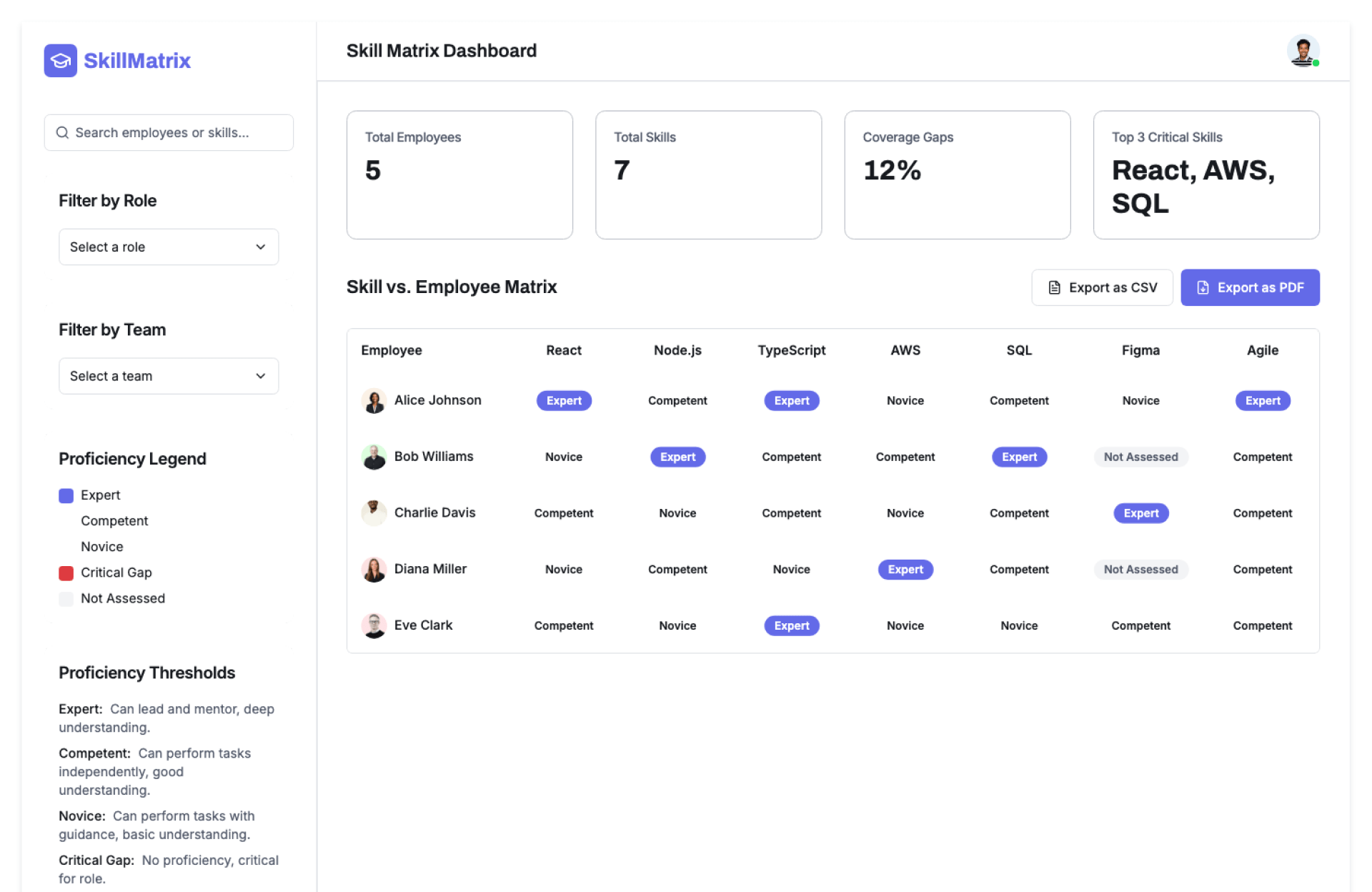 The Skill Matrix Visualizer is a ready-to-use yet fully customizable application that enables organizations to create dynamic skill maps for employees, teams, and departments. Built on the Kriatix AI platform, it helps assess proficiency levels, identify gaps, track certifications, and align skills with business goals—all from a centralized dashboard.