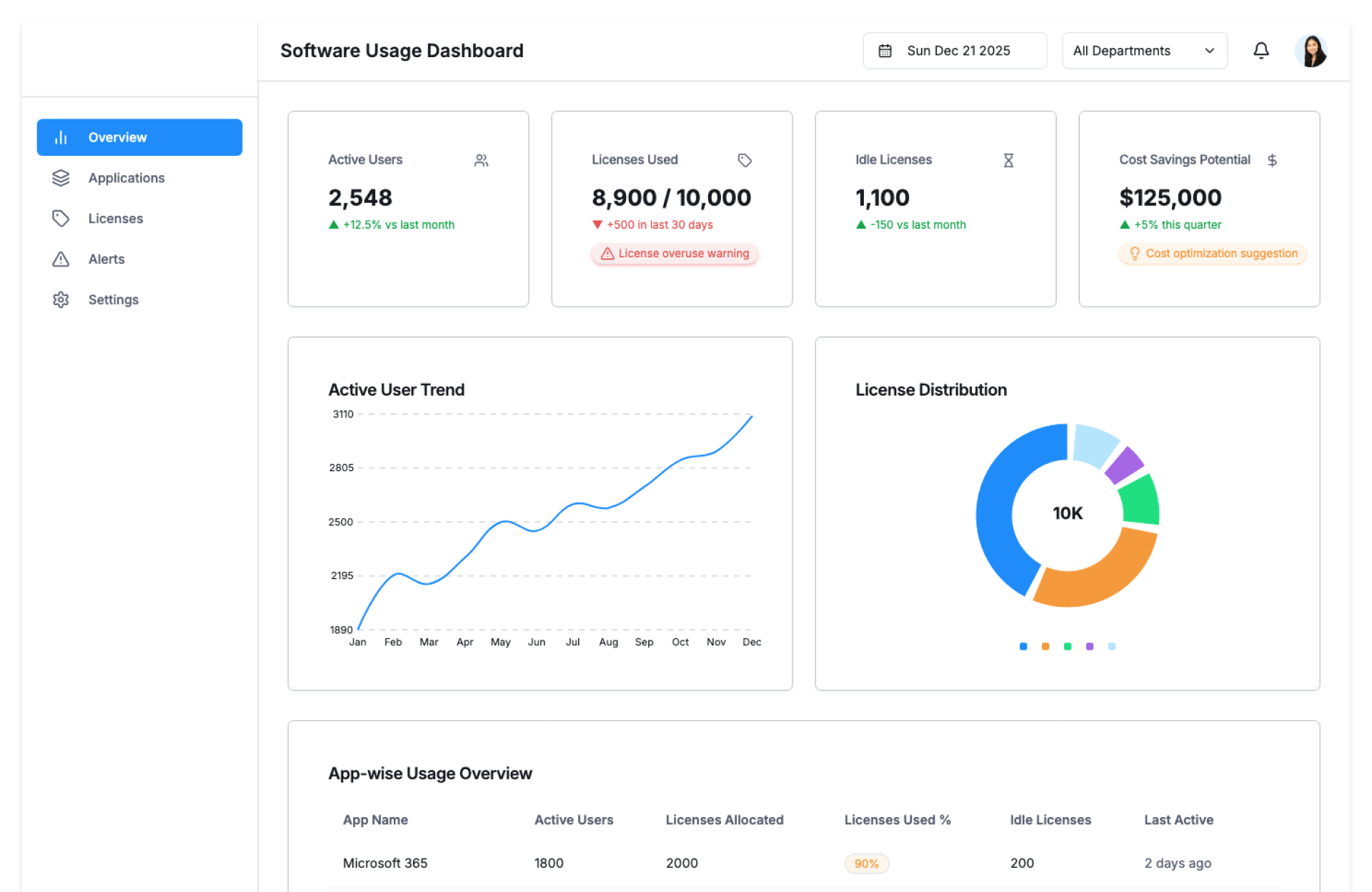The Software Usage Tracker Dashboard is a ready-to-use yet fully customizable analytics solution designed to track application usage, user activity, and engagement patterns across your organization. Built on the Kriatix AI platform, it enables real-time monitoring, automated reporting, and actionable insights to help businesses make smarter IT and operational decisions—without complex setup.