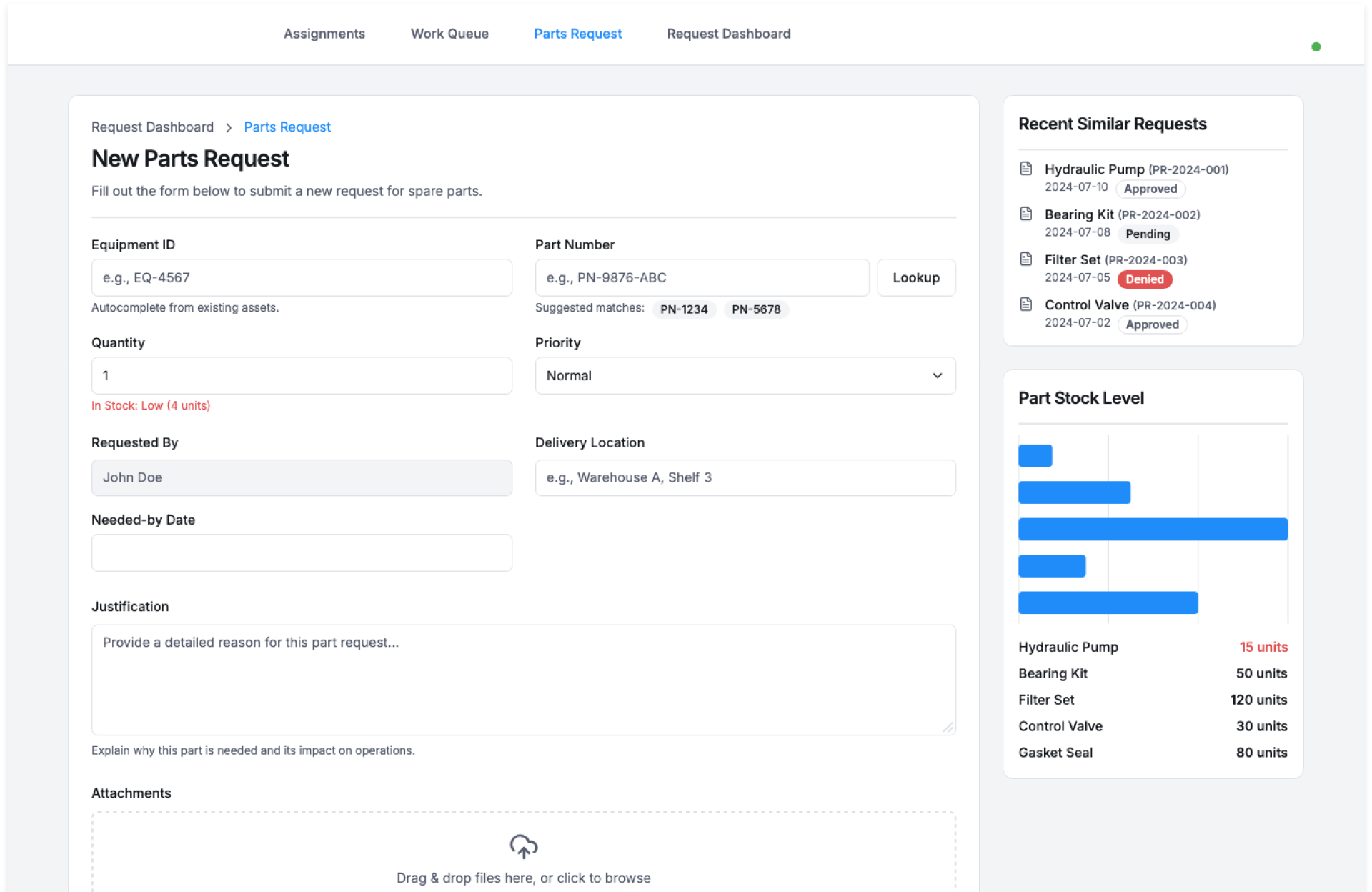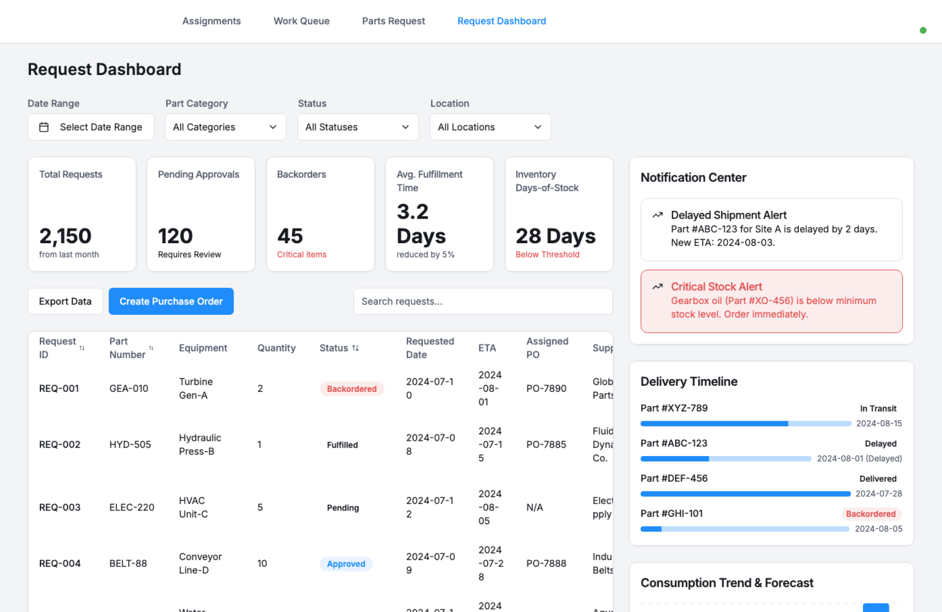 The Spare Parts Request Tracker is an AI-powered solution that centralizes spare parts request management. It allows teams to submit requests, route them for approval, track inventory availability, and monitor fulfillment status across locations.