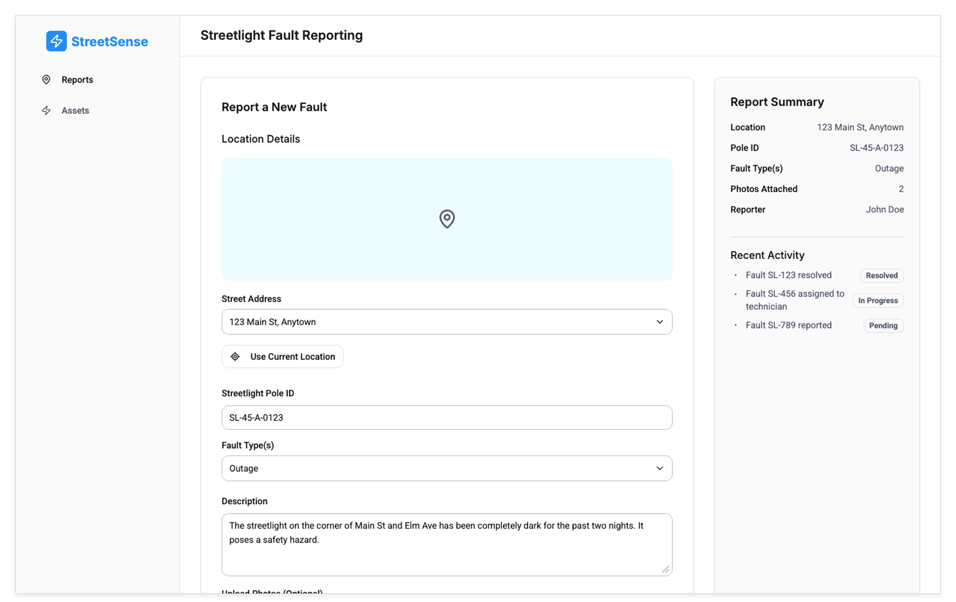The Streetlight Fault Report Form is an AI-powered digital form that captures streetlight issue details such as location, fault type, and supporting information. Submitted reports are routed to the relevant maintenance teams for action.