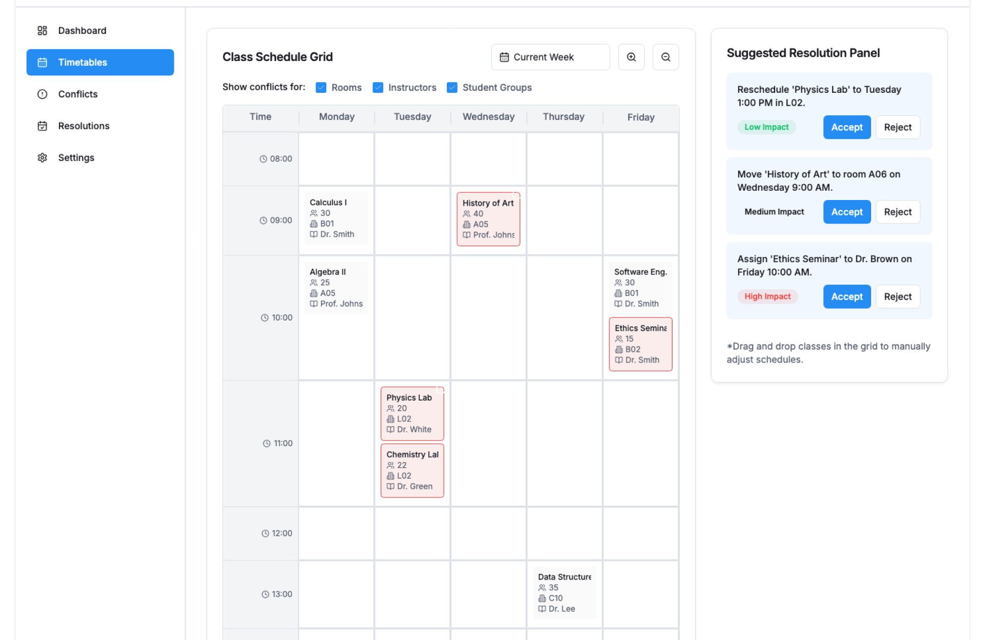 - Resolve Issues – Adjust slots, faculty, or rooms