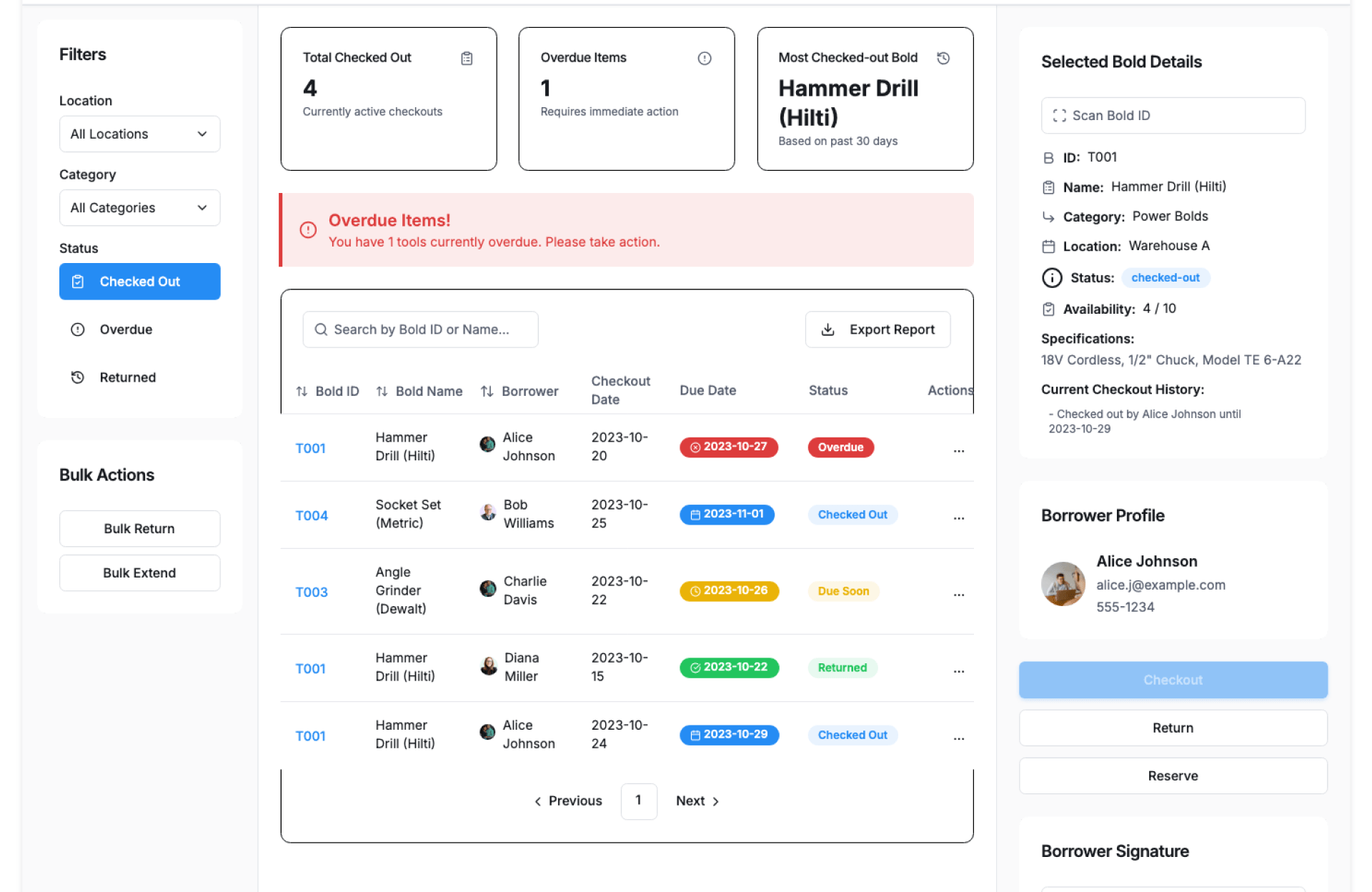 The Tool Checkout Register System is an AI-powered solution that digitizes tool issuance and return tracking. It allows teams to log who has taken a tool, for what task, and when it is due back creating a reliable, audit-ready tool usage record.