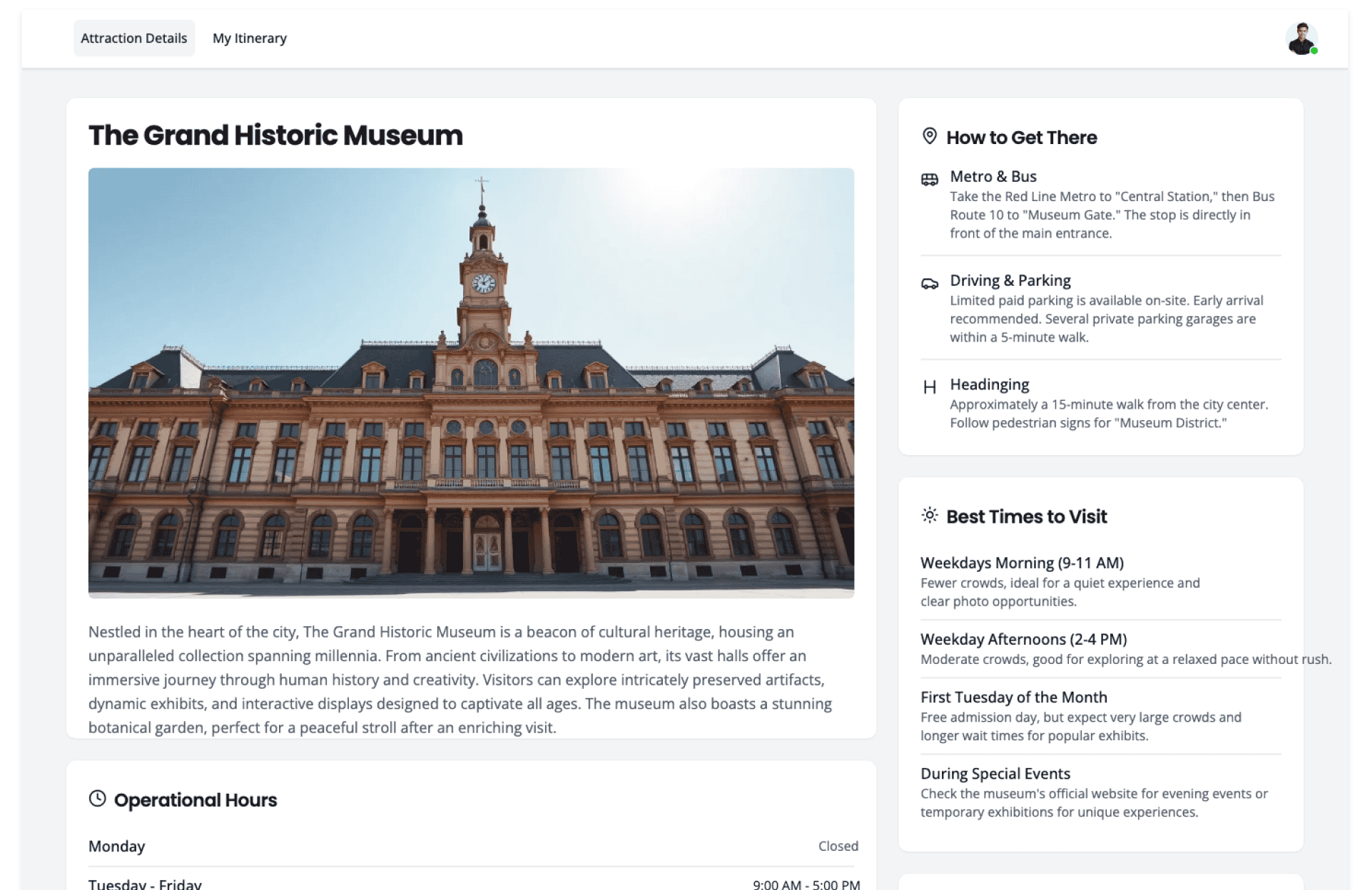 The Tourist Attraction Info Bot is an AI-powered conversational assistant that responds to visitor questions about attractions. It pulls structured information from configured sources and provides quick, consistent answers across supported channels.