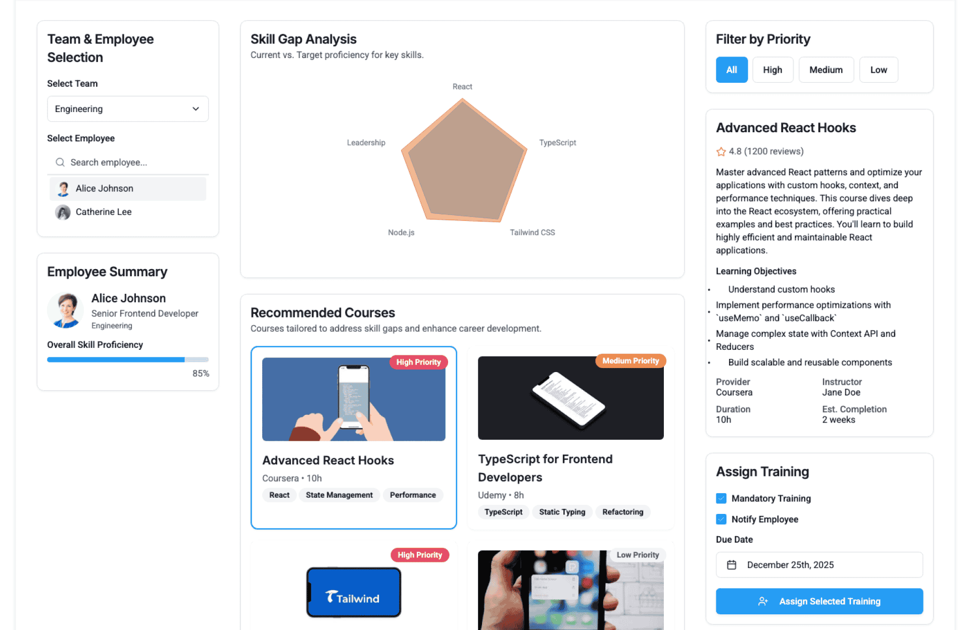 It analyzes employee roles, skills, performance data, and learning history to recommend relevant training programs automatically.