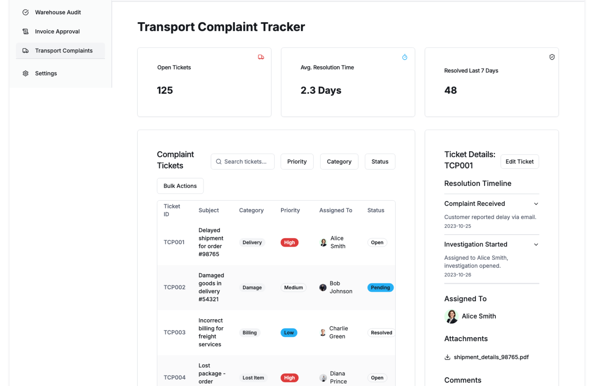 The Transport Complaint Tracker is a ready-to-use and customizable application that helps organizations capture, assign, monitor, and resolve transport-related complaints across channels. Built on the Kriatix AI platform, it enables structured complaint handling, SLA tracking, automated escalations, and performance insights—without complex development.