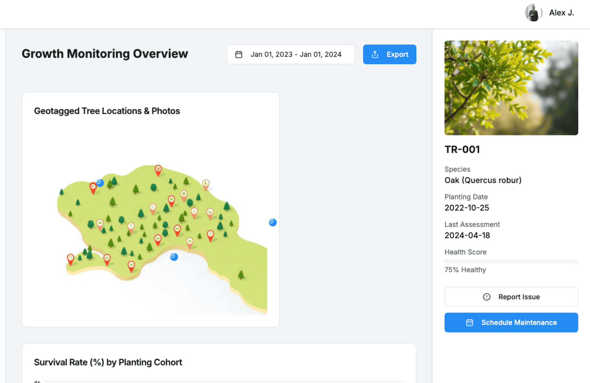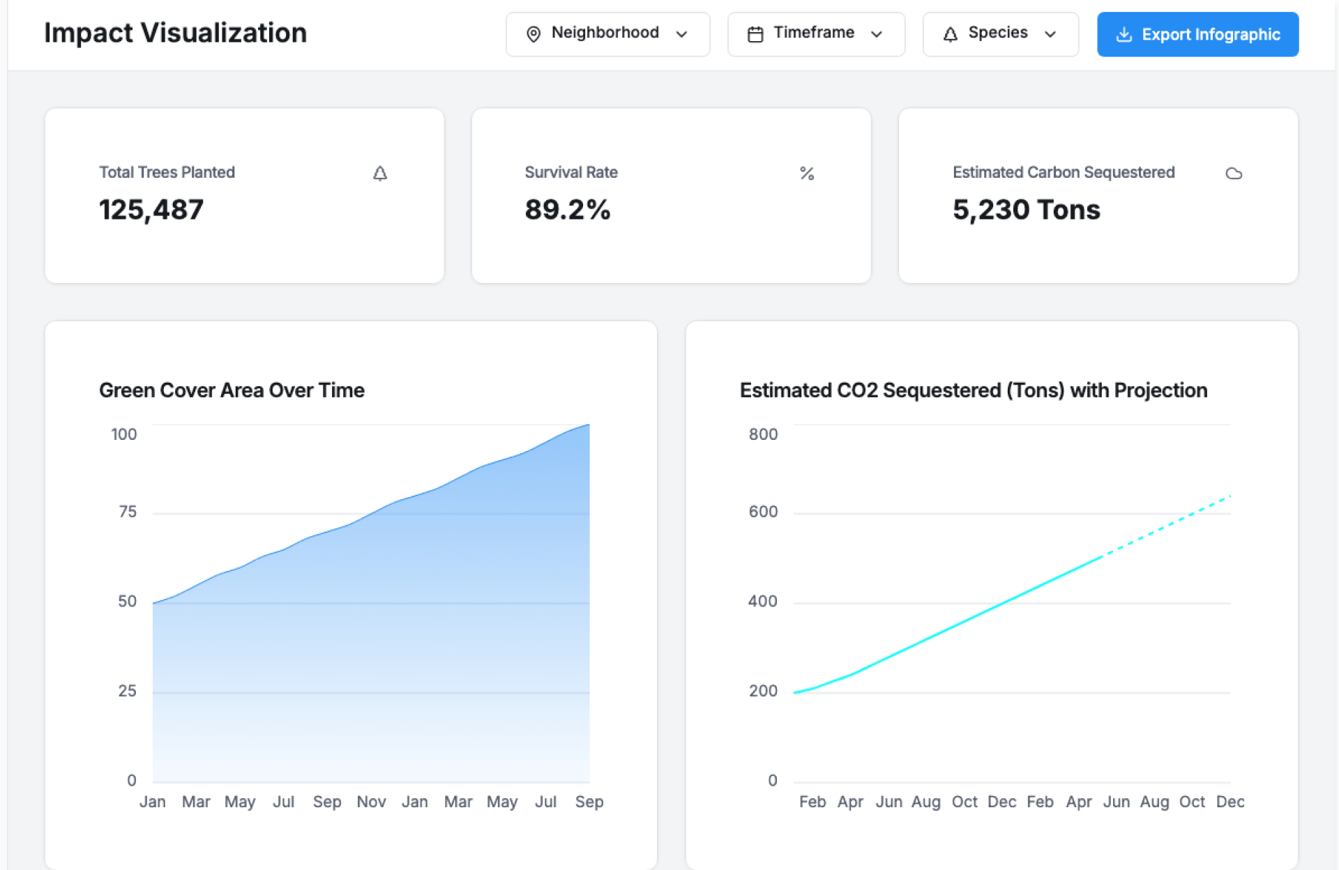 The Tree Plantation Tracker Dashboard is an AI-powered monitoring solution that captures plantation data and visualizes progress through interactive dashboards. It helps stakeholders track plantation targets, locations, and outcomes over time.