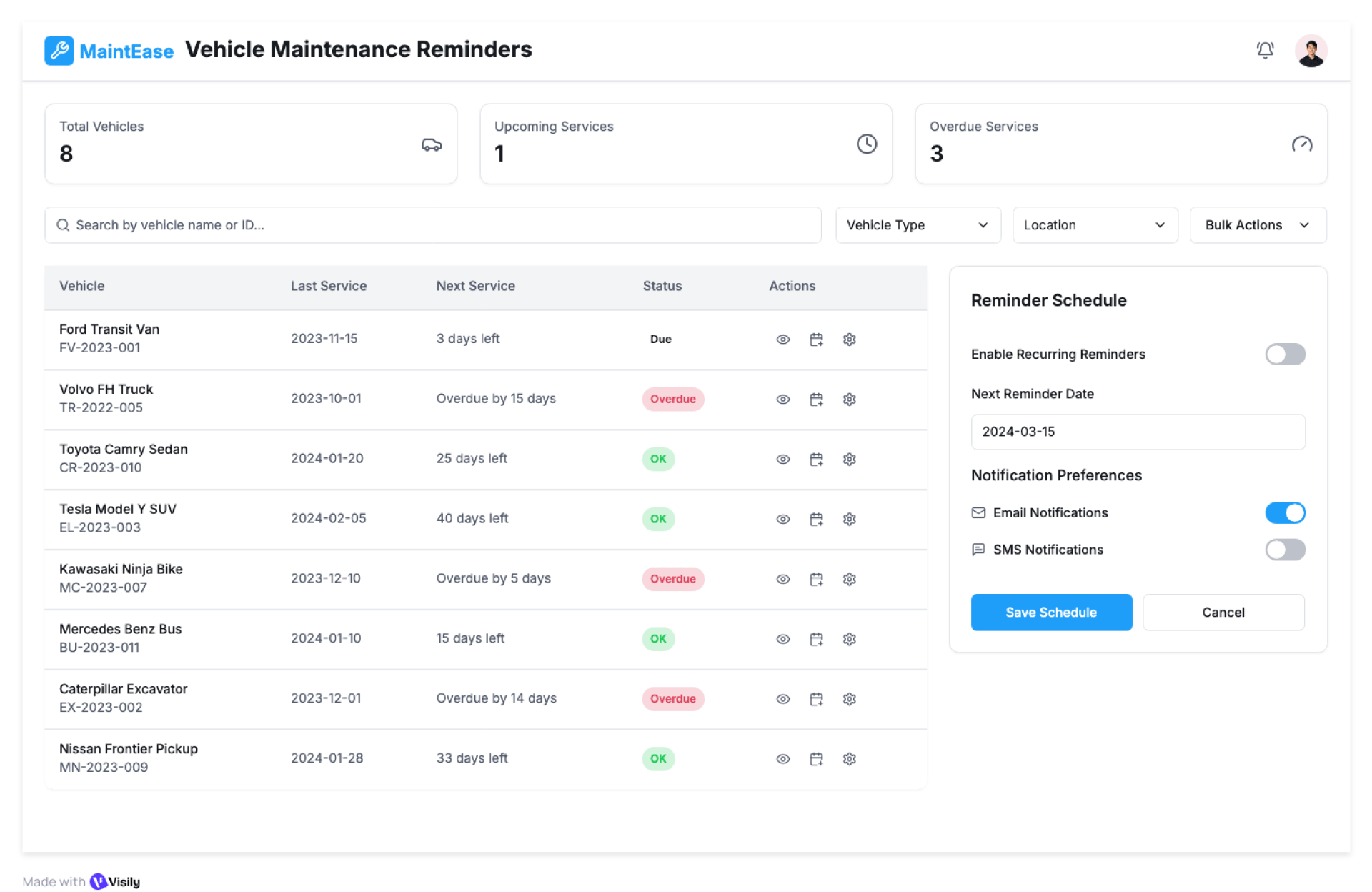 The Vehicle Maintenance Reminder App by Kriatix helps businesses and individuals track vehicle servicing, inspections, and renewals from one centralized dashboard. Whether you manage a single car or an entire fleet, this app ensures timely maintenance, reduced breakdowns, and longer vehicle life through automated reminders and clear service history.