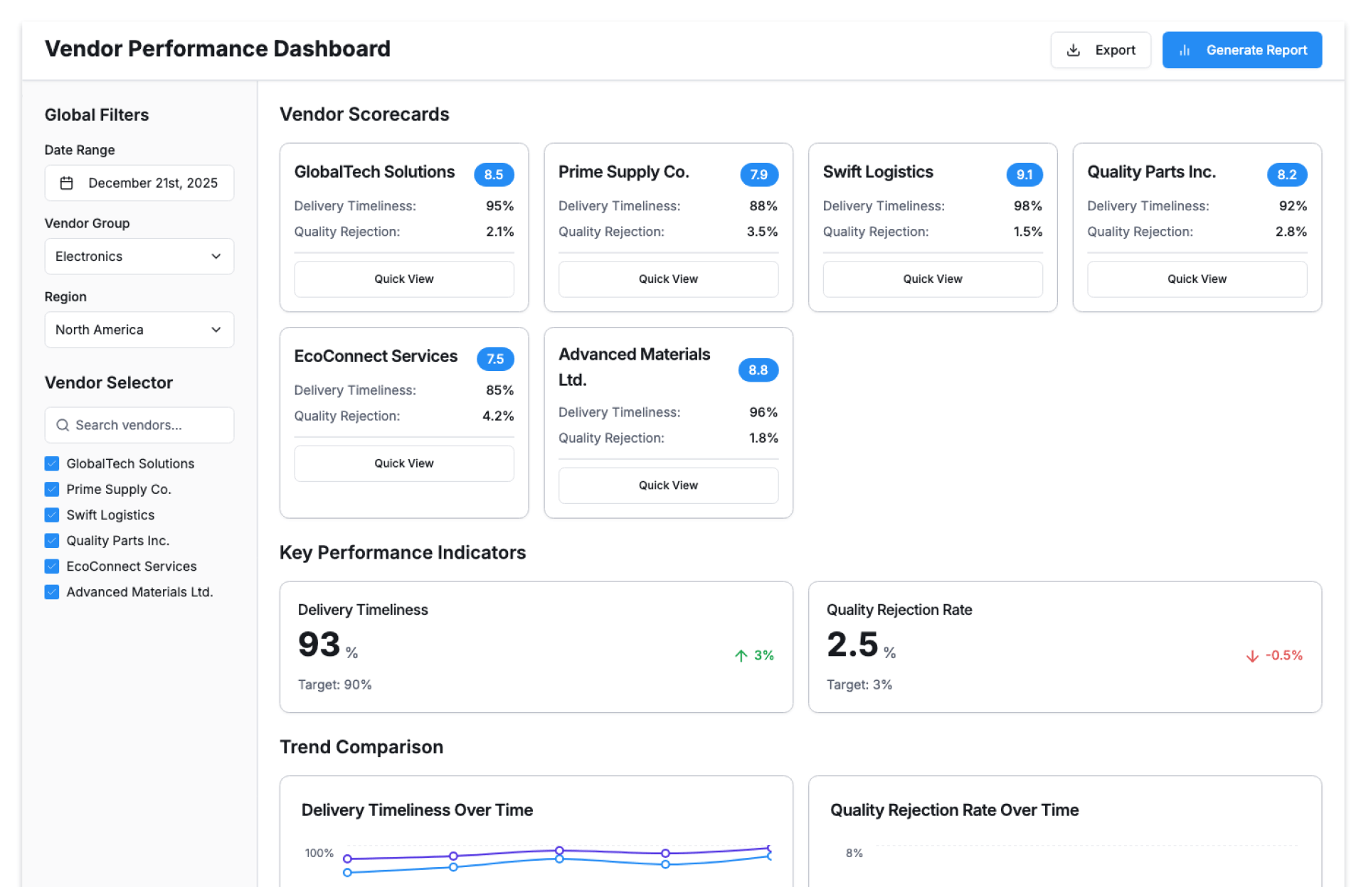 The Vendor Performance Dashboard is an AI-powered analytics solution that consolidates supplier data into a single performance view. It tracks key vendor metrics across orders, deliveries, quality issues, and response times, helping teams identify high-performing and underperforming vendors.
