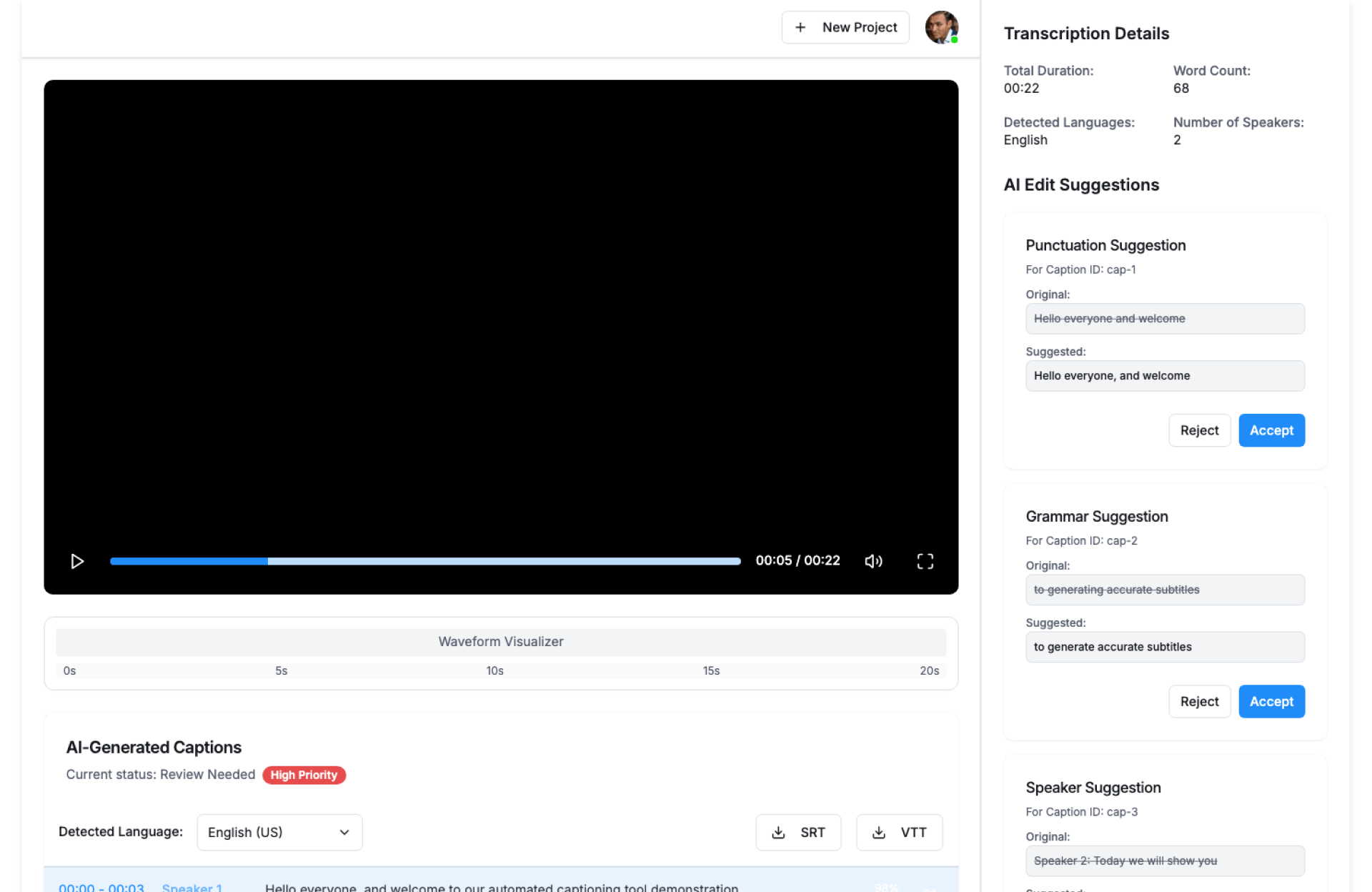 The Video Caption Generator by Kriatix automatically generates clear, time-synced captions for videos. It improves accessibility, comprehension, and engagement—while saving teams hours of manual captioning.