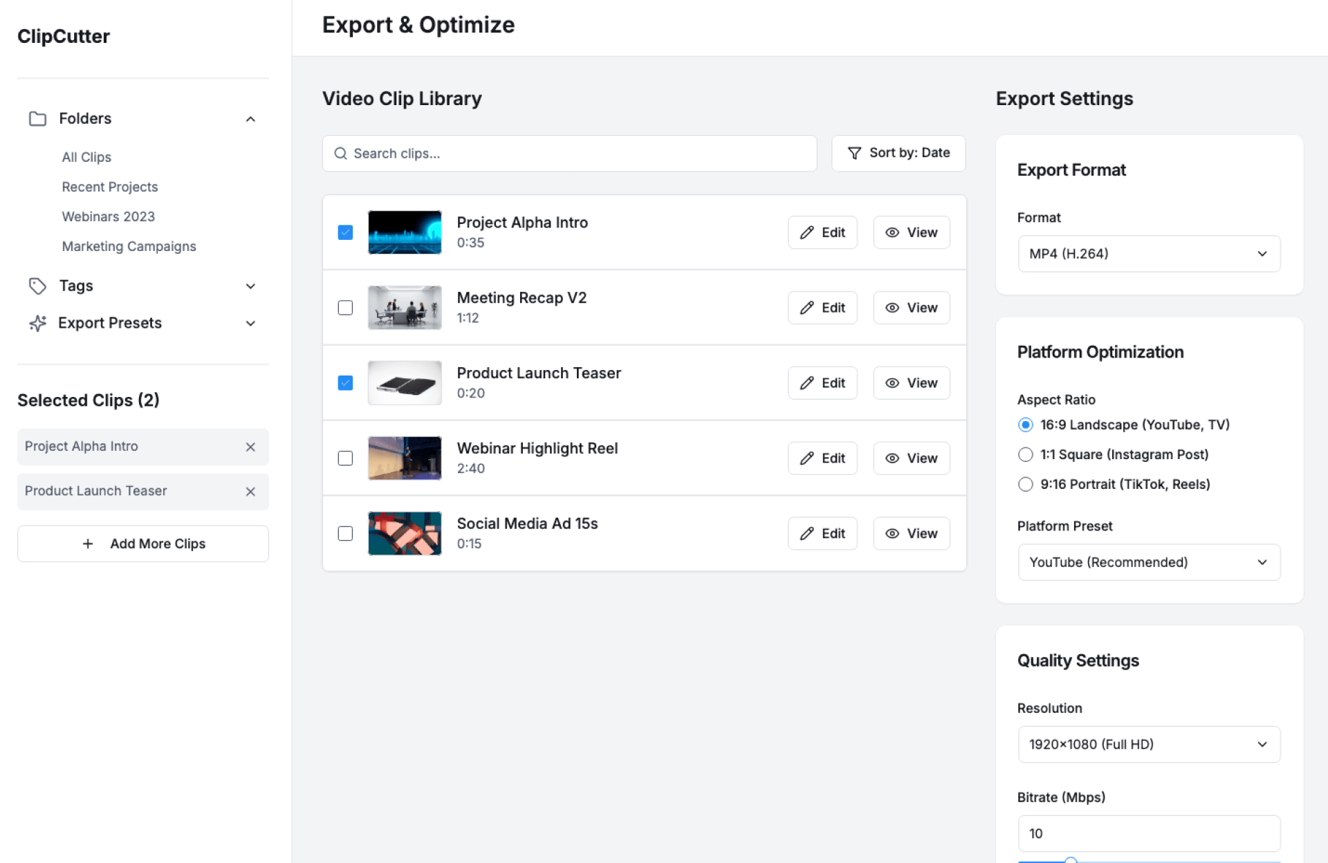 The Video Clip Cutter Tool is a ready-to-use application that allows you to cut, trim, and export short video clips from longer recordings. It removes the need for complex editing software and helps creators and marketers produce platform-ready video snippets with speed and precision.