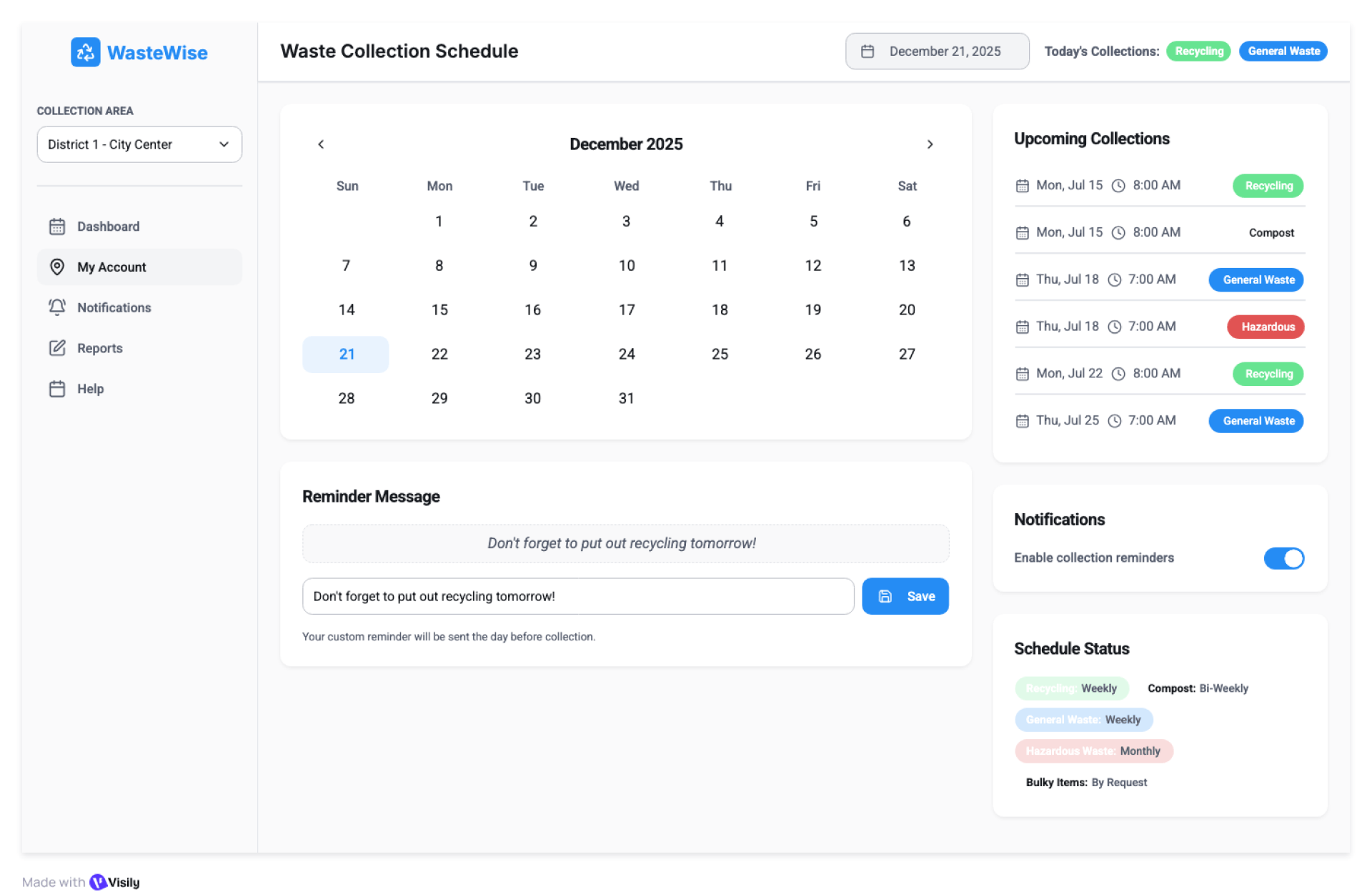 The Waste Collection Schedule Notifier by Kriatix helps municipalities and communities inform residents about waste collection dates and changes. It sends timely notifications, reduces missed pickups, and improves public awareness.