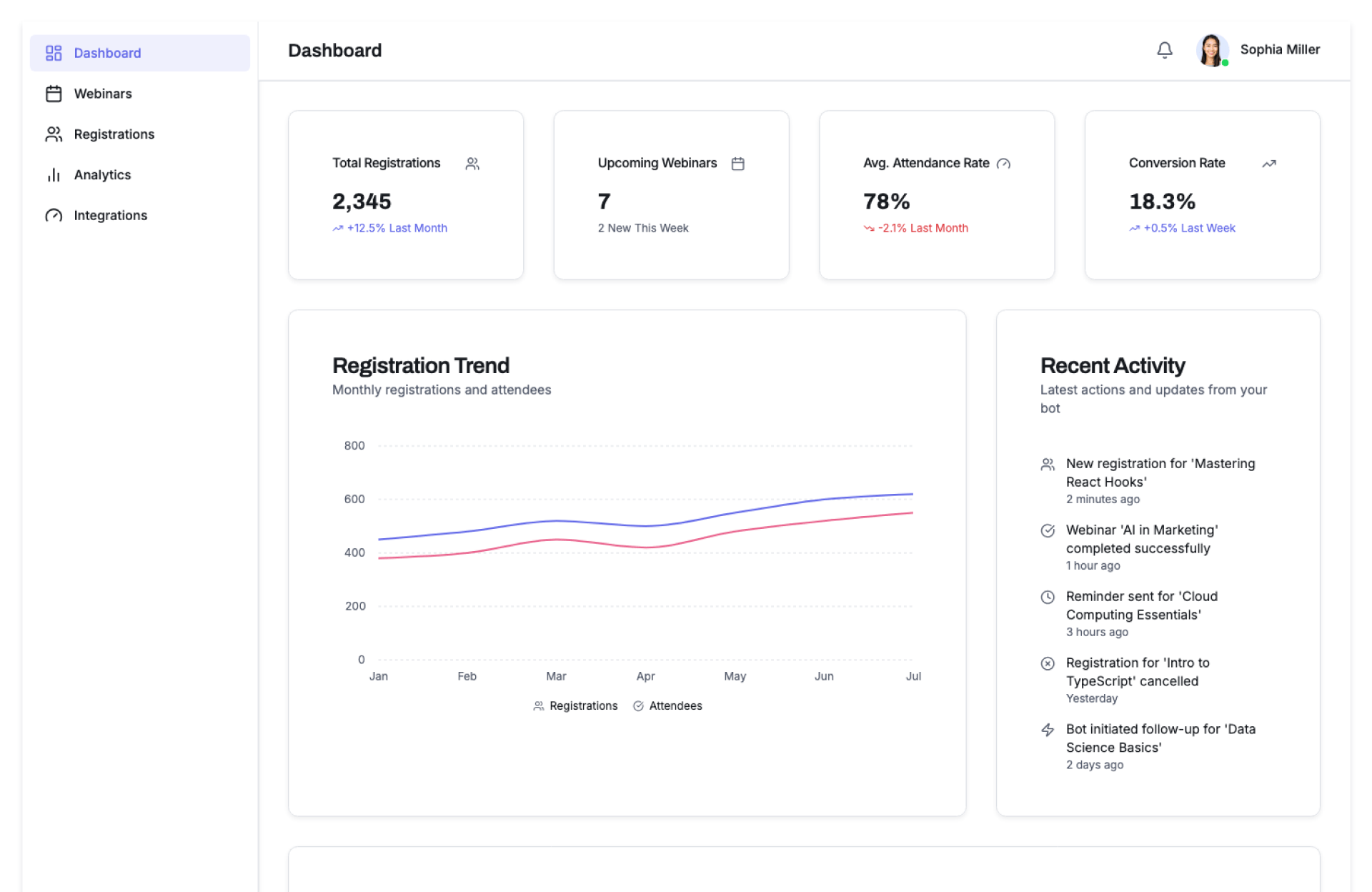 The Webinar Registration Bot is a ready-to-deploy conversational assistant that captures attendee details, registers users instantly, sends confirmations, and syncs data with your webinar platforms and CRM systems. It works across web chat, WhatsApp, and other messaging channels to provide a smooth registration experience for users.