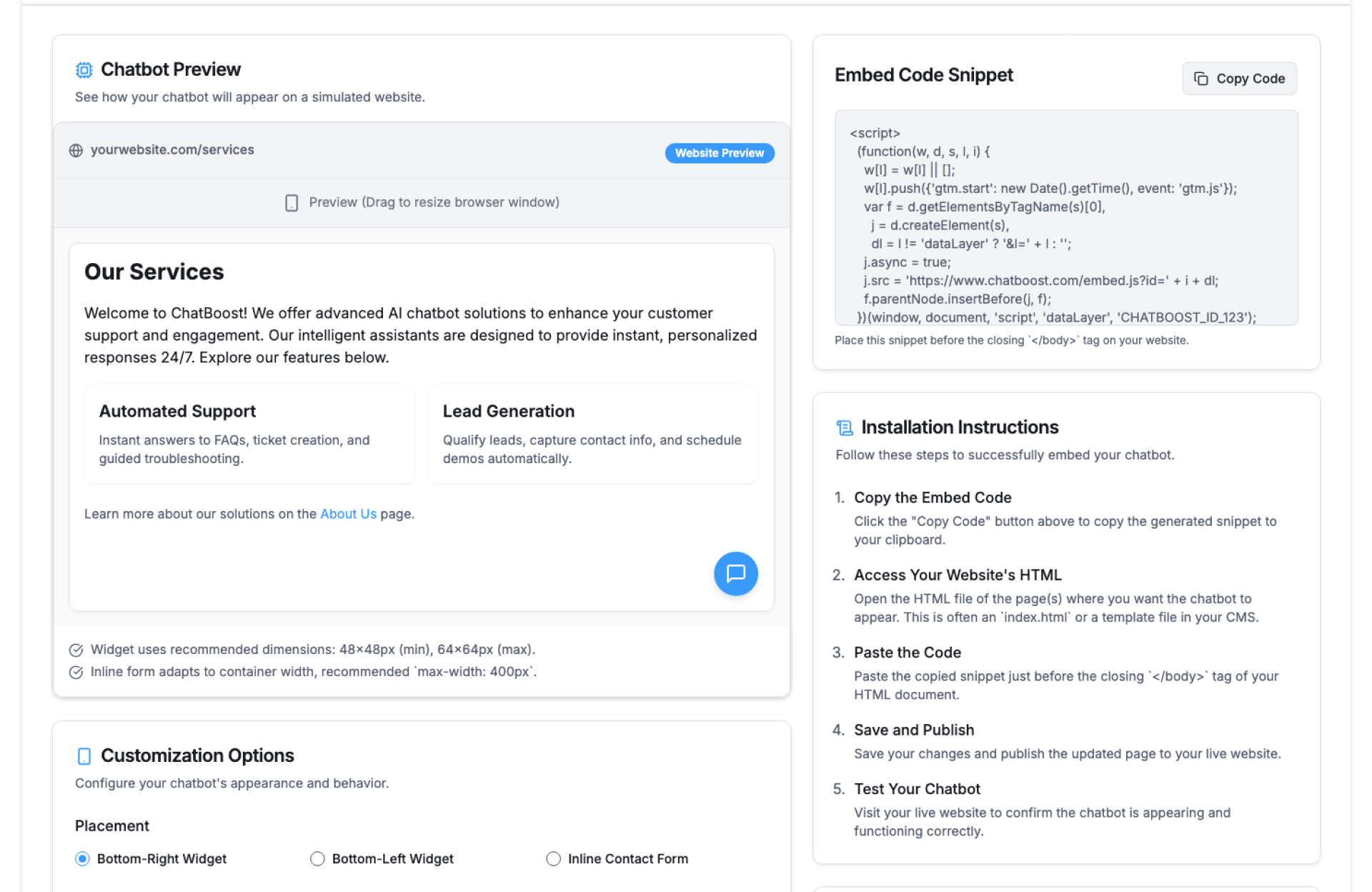 - Install Chatbot – Add widget to your website or landing pages
