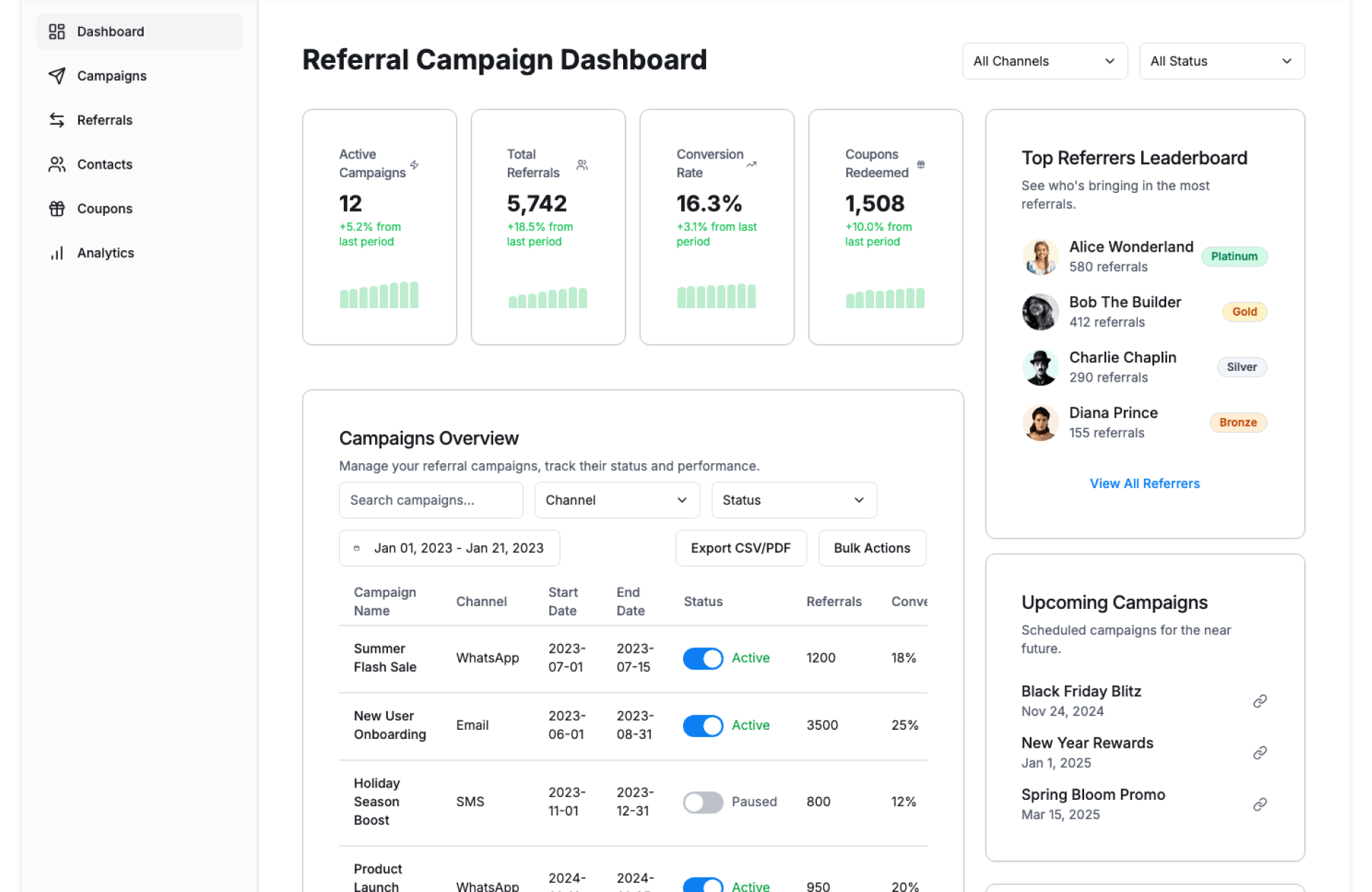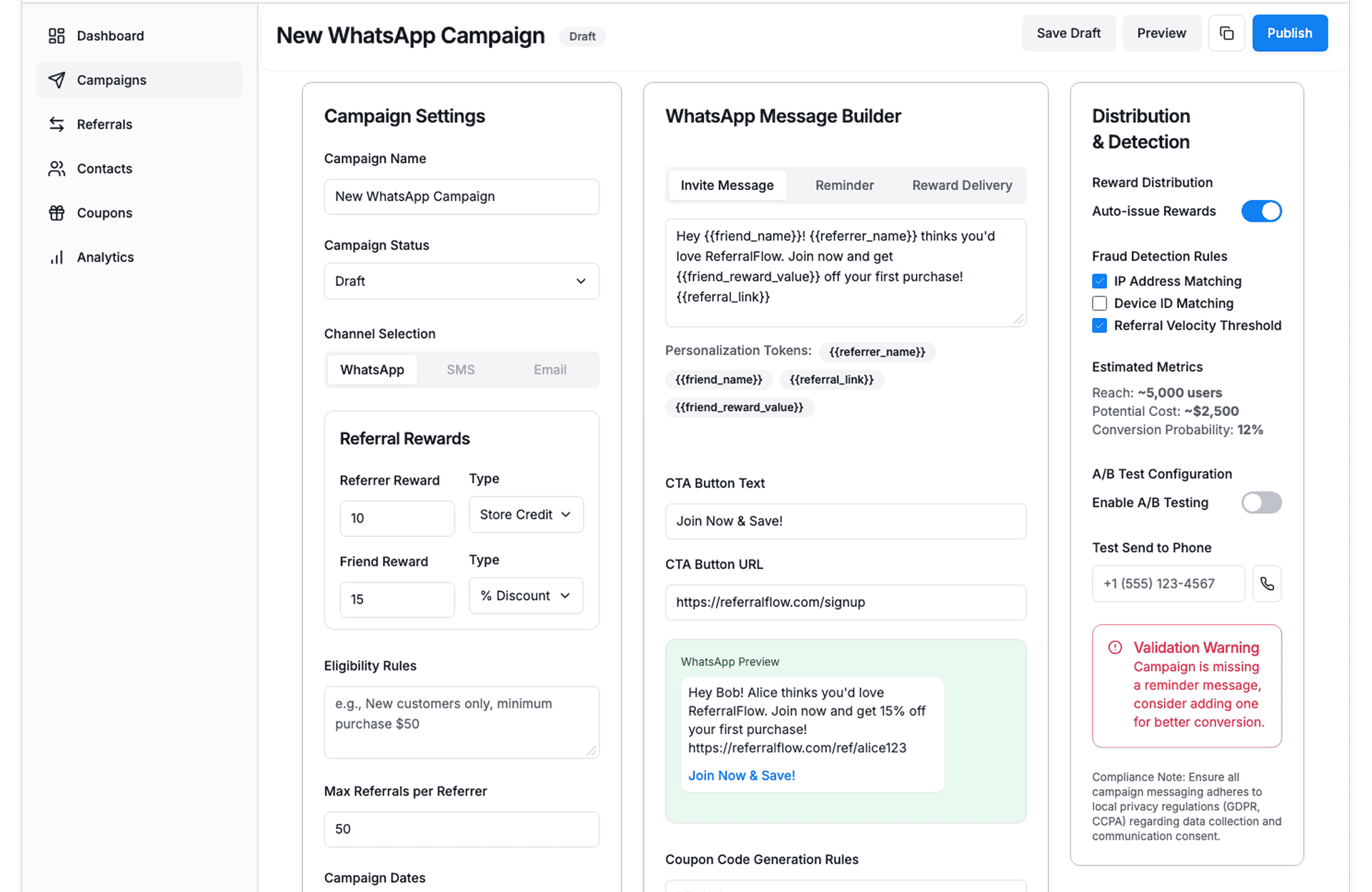 The WhatsApp Referral Campaign Bot is an AI-powered solution that manages end-to-end referral campaigns via WhatsApp. It invites customers to participate, generates referral links or codes, tracks referrals, and shares reward updates automatically.